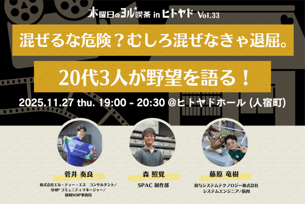 鈴与システムテクノロジー株式会社(本社:静岡市清水区、代表取締役社長:林田敏之、以下SST)は、2025年11月27日(木)に静岡市人宿町で開催されるトークイベント「木曜日のヨル喫茶inヒトヤド(通称:木ヨル)」にて、当社の若手社員が登壇することをお知らせします。