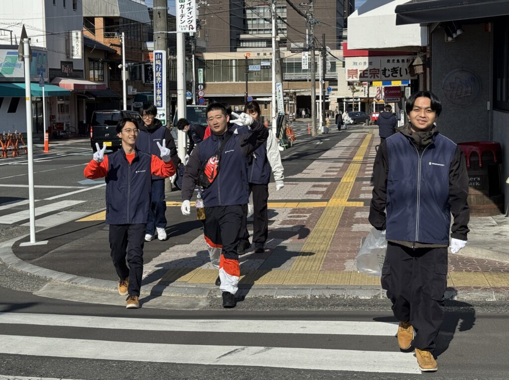 当日は、学生や地域の皆さんと挨拶を交わして清掃エリアへ向かい、和やかな雰囲気のなか活動がスタートしました。今回は初めて参加してくれた社員も複数おり、これまで参加経験がなかったメンバーも地域活動に加わる機会となりました。