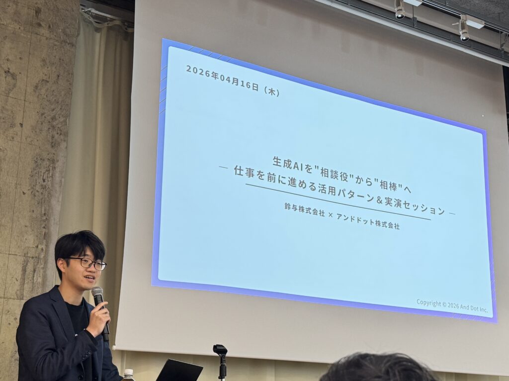 本セミナーでは、アンドドット株式会社(本社:東京都渋谷区、代表取締役:茨木雄太)がメイン講師として講義を担当し、SSTはプログラムの一部として、AI活用を進めていく上での考え方や、人材育成・研修の全体像について紹介しました。